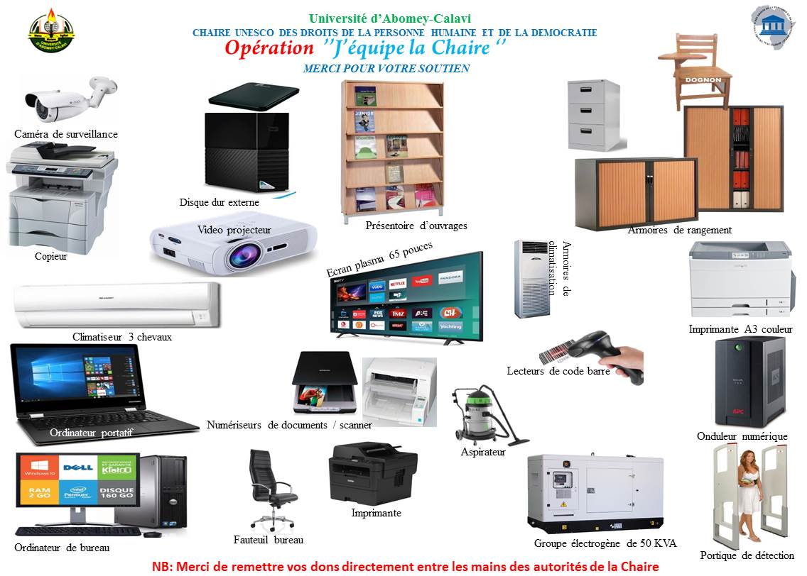 En raison de la crise sanitaire, la Chaire UNESCO des Droits de la Personne Humaine et de la Démocratie se doit de dynamiser ses activités en les adaptant à la situation actuelle. Elle ambitionne de se doter de nouveaux équipements et de mettre en place de nouveaux espaces et méthodes de travail, de pôles de recherche et d’actions pour ainsi contribuer à l’excellence de ses auditeurs, à la sensibilisation aux droits humains et à la démocratie au Bénin et en Afrique. La générosité du public et les dons sont nécessairement indispensables pour rendre possibles ces projets.